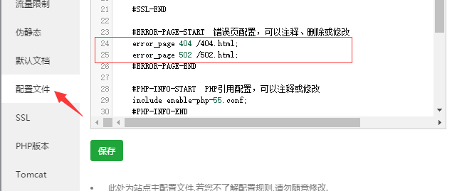 - 网站 –> 选择你的网站 设置 –> 配置文件 这里有 nginx 的代码, 找寻404的配置